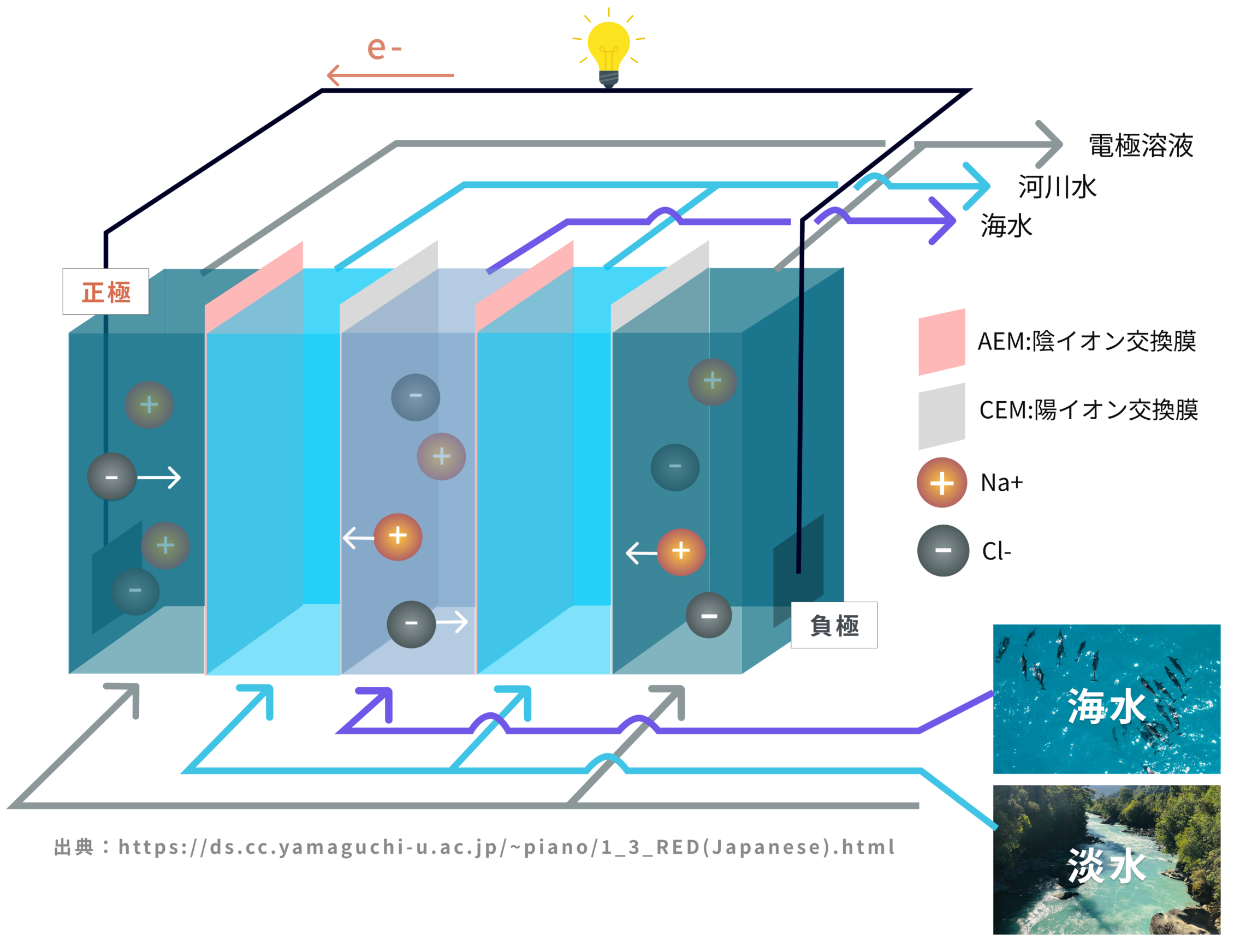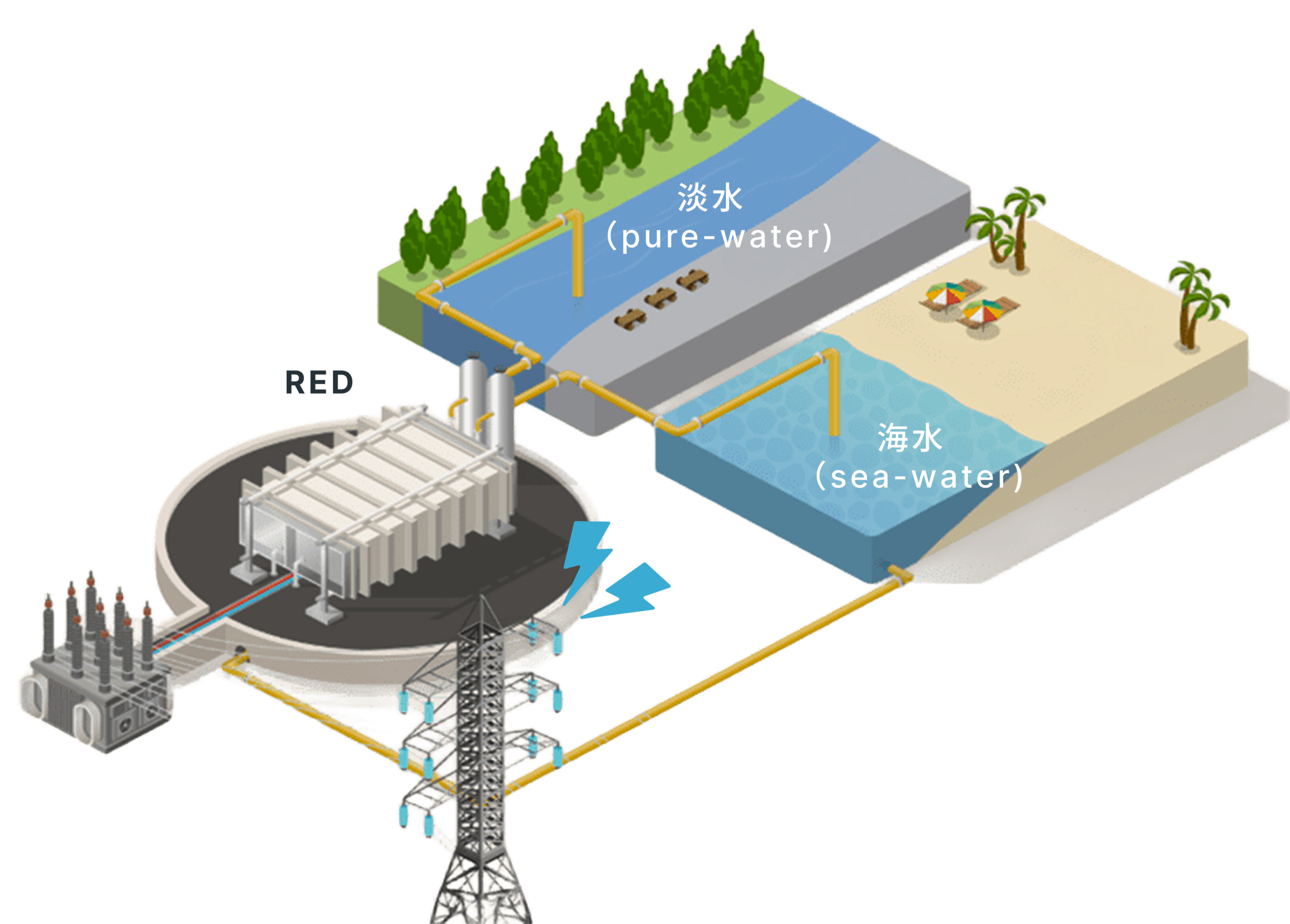 「塩分濃度差発電(RED)」。