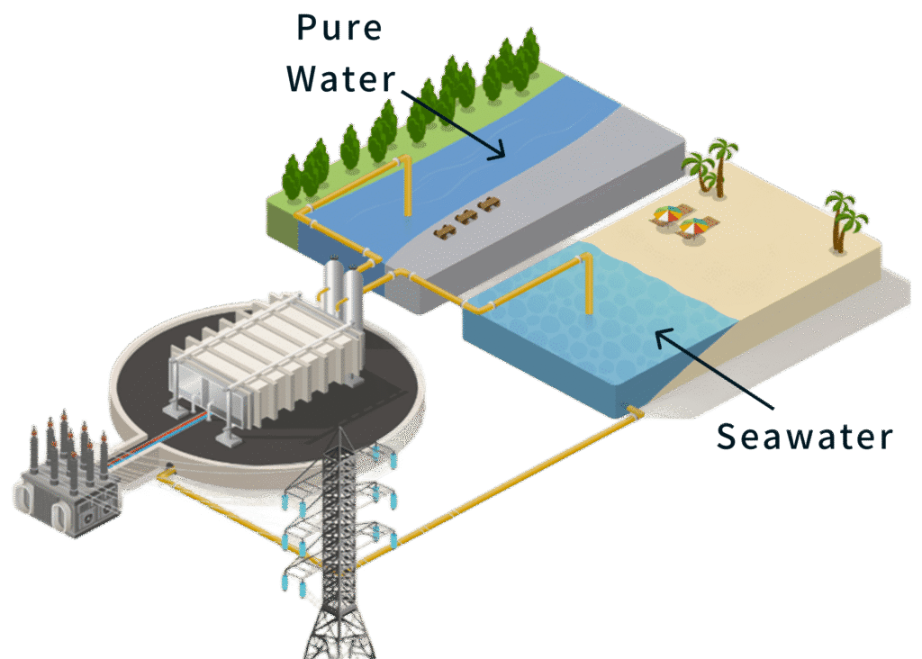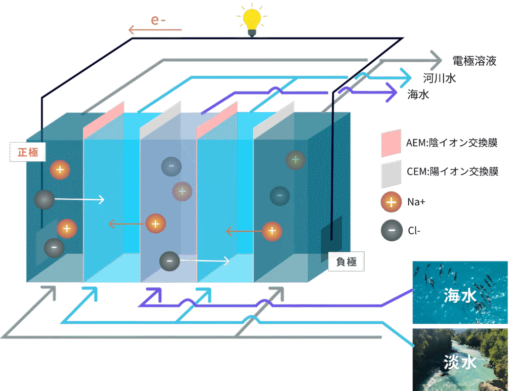 それは、あるがままの自然「海水」と「淡水」の “塩分濃度のちがい”から電気を生み出す、革新的な再生可能エネルギー。